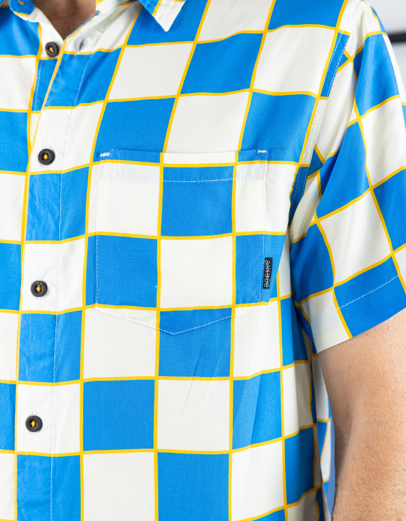 Lávalo a máquina en frío, del revés y con colores similares, y sécalo a baja temperatura. Evita detergentes agresivos o lejía para conservar el estampado vibrante y la suavidad de la tela. Plancha a baja temperatura si es necesario. Estos cuidados preservan la sensación lujosa de la tela y evitan daños en los botones grabados de corozo y los detalles cosidos.